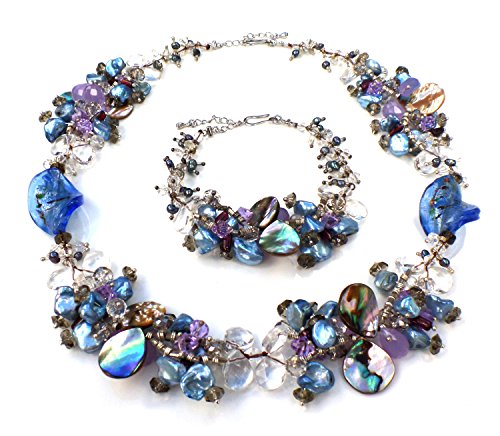 Best Seller! Blue Freshwater Pearl, Murano Glass, Mother of Pearl, Moonstone and Crystal Cluster Necklace Bracelet Earrings (Necklace + Bracelet + Earrings Set) (Necklace + Bracelet Set) Review
