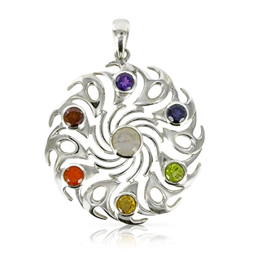 Large silver pendant, the Chakra Vortex, with 7 faceted gemstones corresponding to the 7 chakras in colour and qualities! Very energetic piece of jewellry, like a vortex of energy, charges up and activates every chakra, helps to align the energy field. Garnet, carnelian, citrine, peridot, iolite, amethyst and moonstone. The Size: 52mm (Including hoop)