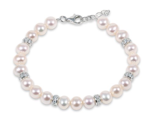 This contemporary white cultured freshwater pearl bracelet adds a contemporary twist to a timeless classic. This adjustable 7-inch bracelet features 7-7.5mm semi round white cultured freshwater pearls with sterling silver and cubic zirconia rondells. Finished with a beautifully crafted sterling silver clasp, this bracelet can be worn casually or formally, putting a stylish finish on any outfit it graces.