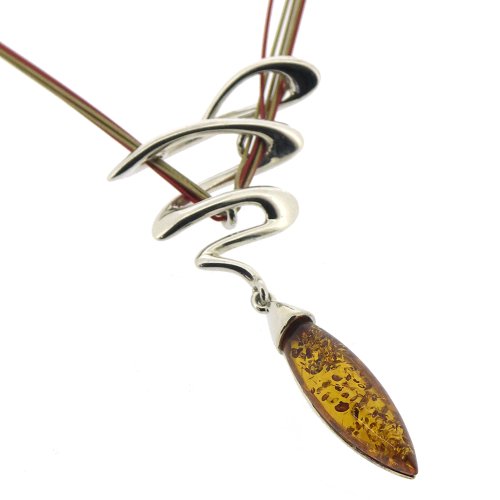 This necklace is a modern and sophisticated design sure to turn heads. Crafted from sterling silver the marquise shaped Amber pendant is suspended from a swish of silver reminiscent of a brush mark. Entwined with a beautiful 44 cm multi strand steel necklace in colours of red and gold, with a sterling silver clasp. Comes complete with a smart black branded presentation box. All our amber is natural, therefore colour and inclusions may vary slightly.