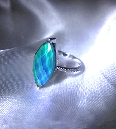 Sterling Silver Mood Ring. Fully hallmarked by Birmingham Assay office as Sterling Silver. Beautiful mood ring with crystals around the side. Horse eye shaped mood bead with faceted design. Weight of Silver approximately 2.5 grams. Horse Eye 'mood' size is 17x8mm. Elegant looking ring. Sterling Silver mood rings are more water resistant than costume jewellery rings but please take care around the mood ring. Also do not use silver dips but use a silver polishing cloth to clean (avoiding the mood area)